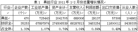 據(jù)國(guó)家統(tǒng)計(jì)局公布的數(shù)據(jù)(按往年慣例,1-2月份的經(jīng)濟(jì)指標(biāo)數(shù)據(jù)合并在一起),2011年1-2月份我國(guó)規(guī)模以上(自2011年起,規(guī)模以上企業(yè)劃分標(biāo)準(zhǔn)調(diào)整為年主營(yíng)業(yè)務(wù)收入2000萬元及以上工業(yè)法人企業(yè))真絲行業(yè)企業(yè)數(shù)量為470家,占紡織全行業(yè)的1.33%;工業(yè)總產(chǎn)值為72.54億元,占1.07%;資產(chǎn)合計(jì)為204.17億元,占0.74%;主營(yíng)收入為68.93億元,占1.04%;利潤(rùn)總額為2.91億元,占0.84%;出口交貨值為5.73億元,占0.49%;從業(yè)人數(shù)為10.49萬人,占1.11%。由此可見,真絲行業(yè)總產(chǎn)值、總資產(chǎn)、主營(yíng)收入、利潤(rùn)總額、出口和就業(yè)均給紡織全行業(yè)作出了一定的貢獻(xiàn)。