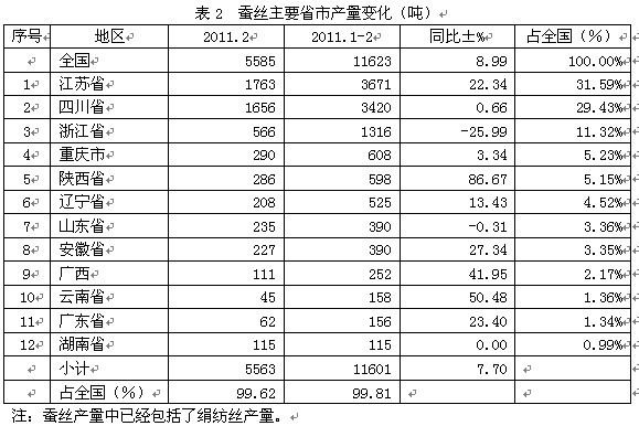 全國(guó)蠶絲2011年1-2月份產(chǎn)量合計(jì)為1.162萬噸,比上年同期增加8.99%;其中產(chǎn)量最大的省市是江蘇省,產(chǎn)量為0.37萬噸,為省市龍頭;其次是四川省,產(chǎn)量0.34萬噸,位居亞軍;然后是浙江省,產(chǎn)量0.13萬噸,榮立第三;重慶市0.06萬噸,為第四;陜西省0.06萬噸,占第五;遼寧省0.05萬噸,位居第六;接下來是山東省0.04萬噸,為第七;安徽省0.04萬噸,占第八;廣西0.03萬噸,位居第九;云南省0.02萬噸,為第十名;廣東省0.02萬噸,居第11名;湖南省0.01萬噸,榮立第12名。上述12大省市2011年1-2月份產(chǎn)量合計(jì)為1.160萬噸,占全國(guó)2011年1-2月份總產(chǎn)量的99.81%。
