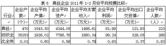 從企業(yè)平均規(guī)模的變化情況看,2011年1-2月份真絲企業(yè)平均產(chǎn)值為1543萬元,為紡織全行業(yè)平均數(shù)的0.80倍;企業(yè)平均資產(chǎn)為4344萬元,為行業(yè)平均數(shù)的0.56倍;企業(yè)平均主營(yíng)收入為1467萬元,為行業(yè)平均數(shù)的0.78倍;企業(yè)平均利潤(rùn)為61.99萬元,為行業(yè)平均數(shù)的0.63倍;企業(yè)平均出口交貨值為121.93萬元,為行業(yè)平均數(shù)的0.37倍;企業(yè)平均人數(shù)為223人,為行業(yè)平均數(shù)的0.83倍。由此可見,真絲企業(yè)的平均規(guī)模低于紡織全行業(yè)的平均水平,反映該行業(yè)中小企業(yè)較多,與該行業(yè)的特點(diǎn)較為接近。