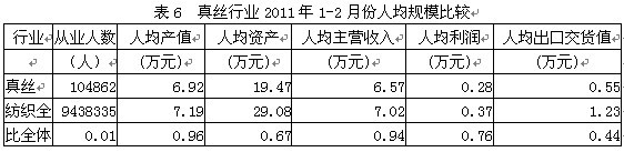 從行業(yè)人均規(guī)模的變化情況看,2011年1-2月份真絲行業(yè)人均產(chǎn)值為6.92萬元,為紡織全行業(yè)平均數(shù)的0.96倍;人均資產(chǎn)為19.47萬元,為行業(yè)平均數(shù)的0.67倍;人均主營(yíng)收入為6.57萬元,為行業(yè)平均數(shù)的0.94倍;人均利潤(rùn)為0.28萬元,為行業(yè)平均數(shù)的0.76倍;人均出口交貨值為0.55萬元,為行業(yè)平均數(shù)的0.44倍。由此可見,真絲行業(yè)的人均產(chǎn)值、人均資產(chǎn)、人均主營(yíng)收入、人均利潤(rùn)低于紡織全行業(yè)的平均數(shù),反映該行業(yè)勞動(dòng)生產(chǎn)率和綜合競(jìng)爭(zhēng)力低于全行業(yè)平均水平,對(duì)全行業(yè)也有所貢獻(xiàn)。