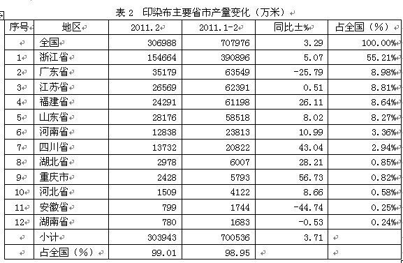 從2011年2月份的情況看,全國印染布當(dāng)月總產(chǎn)量為30.70億米,上述12大省市的當(dāng)月產(chǎn)量合計(jì)為30.39億米,占全國當(dāng)月總產(chǎn)量的99.01%;由此可見,我國前12大省市的印染布產(chǎn)量約占全國總產(chǎn)量的絕大部分。