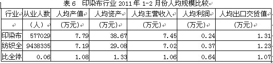 從行業(yè)人均規(guī)模的變化情況看,2011年1-2月份印染布行業(yè)人均產(chǎn)值為7.79萬元,為紡織全行業(yè)平均數(shù)的1.08倍;人均資產(chǎn)為38.67萬元,為行業(yè)平均數(shù)的1.33倍;人均主營收入為7.45萬元,為行業(yè)平均數(shù)的1.06倍;人均利潤為0.24萬元,為行業(yè)平均數(shù)的0.64倍;人均出口交貨值為1.31萬元,為行業(yè)平均數(shù)的1.07倍。由此可見,印染布行業(yè)的人均產(chǎn)值、人均資產(chǎn)、人均主營收入接近于紡織全行業(yè)的平均水平,反映該行業(yè)勞動(dòng)生產(chǎn)率較高,綜合競爭力一般,對全行業(yè)有一定貢獻(xiàn)。