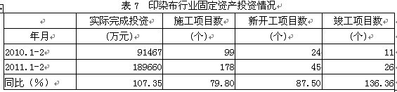 據(jù)國家統(tǒng)計(jì)局公布的數(shù)據(jù),2011年1-2月份印染布行業(yè)實(shí)際完成投資額18.97億元,同比增加107.35%;當(dāng)年以來到目前為止施工項(xiàng)目總數(shù)為178個(gè),同比增加79.80%;其中新開工項(xiàng)目數(shù)45個(gè),同比增加87.50%;截至2月底為止,已實(shí)現(xiàn)竣工項(xiàng)目數(shù)26個(gè),同比增加136.36%,占施工項(xiàng)目總數(shù)的14.61%,表明該行業(yè)投資項(xiàng)目進(jìn)展較好。