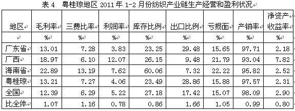 從生產(chǎn)經(jīng)營和盈利狀況看,粵桂瓊紡織產(chǎn)業(yè)鏈毛利率2011年1-2月份為13.21%,為全國平均數(shù)的1.07倍,三費(fèi)比率(營業(yè)、管理和財務(wù)費(fèi)用率之和)為7.27%,為全國平均數(shù)的1.16倍,利潤率為4.06%,為全國平均數(shù)的0.78倍;庫存比率為23.49%,為全國平均數(shù)的0.86倍;出口比例為28.86%,為全國平均數(shù)的1.66倍;企業(yè)虧損面為15.88%,為全國平均數(shù)的1.05倍。由此可見,粵桂瓊地區(qū)的盈利狀況接近于全國紡織產(chǎn)業(yè)鏈的平均水平。
