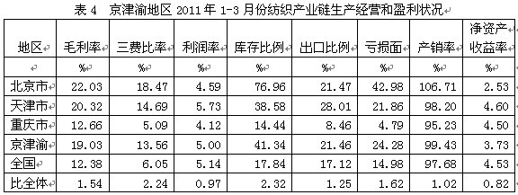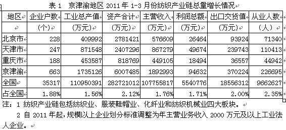 2011年1-3月京津渝紡織產(chǎn)業(yè)鏈經(jīng)濟(jì)運行分析
