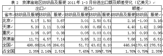 我國京津渝三地2011年1-3月份紡織品及服裝出口額為11.71億美元,占全國紡織品服裝出口總額的2.35%,其中紡織品出口額為4.57億美元,占全國2.14%,服裝出口額為7.14億美元,占全國2.51%;在進(jìn)口方面,京津渝三地紡織品及服裝進(jìn)口額為3.85億美元,占全國紡織品服裝進(jìn)口總額的7.45%,其中紡織品進(jìn)口額為3.22億美元,占全國7.39%,服裝進(jìn)口額為0.63億美元,占全國7.79%;顯示我國京津渝地區(qū)紡織品服裝出口總額遠(yuǎn)高于進(jìn)口總額,順差明顯,表明該地區(qū)紡織品服裝在國際市場上競爭力較強。