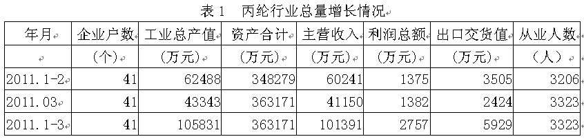 1丙綸行業(yè)總量增長(zhǎng)情況 據(jù)國(guó)家統(tǒng)計(jì)局公布的數(shù)據(jù),2011年1-3月份我國(guó)規(guī)模以上丙綸行業(yè)上下游企業(yè)數(shù)量為41家,該行業(yè)實(shí)現(xiàn)工業(yè)總產(chǎn)值10.58億元,同比增加19.63%;資產(chǎn)合計(jì)36.32億元,同比增加18.62%;實(shí)現(xiàn)主營(yíng)收入10.14億元,同比增加16.69%;完成利潤(rùn)總額0.28億元,比上年同期減少0.441億元,同比減少5.69%;完成出口交貨值0.59億元,同比增加7.40%;行業(yè)整體從業(yè)人數(shù)0.33萬(wàn)人,同比增加2.79%。由此可見(jiàn),丙綸行業(yè)總量增長(zhǎng)勢(shì)頭良好,并為我國(guó)經(jīng)濟(jì)、財(cái)政、出口和就業(yè)作出了重大的貢獻(xiàn)。