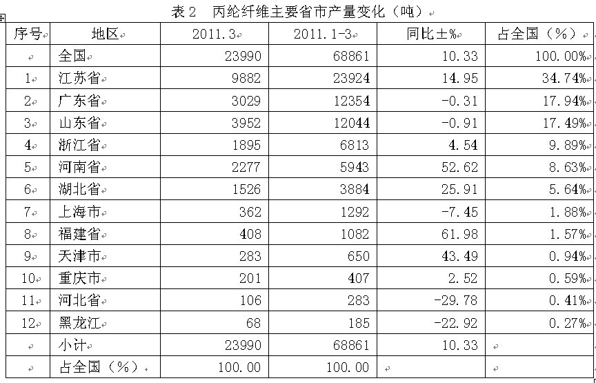 2丙綸纖維主要省市產(chǎn)量變化 全國(guó)丙綸纖維2011年1-3月份產(chǎn)量合計(jì)為6.89萬(wàn)噸,比上年同期增加10.33%;其中產(chǎn)量最大的省市是江蘇省,產(chǎn)量為2.39萬(wàn)噸,為省市龍頭;其次是廣東省,產(chǎn)量1.24萬(wàn)噸,位居亞軍;然后是山東省,產(chǎn)量1.20萬(wàn)噸,榮立第三;浙江省0.68萬(wàn)噸,為第四;河南省0.59萬(wàn)噸,占第五;湖北省0.39萬(wàn)噸,位居第六;接下來(lái)是上海市0.13萬(wàn)噸,為第七;福建省0.11萬(wàn)噸,占第八;天津市0.07萬(wàn)噸,位居第九;重慶市0.04萬(wàn)噸,為第十名;河北省0.03萬(wàn)噸,居第11名;黑龍江0.02萬(wàn)噸,榮立第12名。上述12大省市2011年1-3月份產(chǎn)量合計(jì)為6.89萬(wàn)噸,占全國(guó)2011年1-3月份總產(chǎn)量的100.00%。