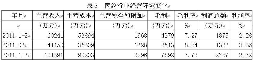 3丙綸行業(yè)經(jīng)營(yíng)環(huán)境變化 2011年1-3月份我國(guó)丙綸行業(yè)產(chǎn)品主營(yíng)收入為10.14億元,產(chǎn)品主營(yíng)成本為9.02億元,產(chǎn)品主營(yíng)稅金和附加為0.33億元,由此可計(jì)算出毛利(主營(yíng)收入-主營(yíng)成本-主營(yíng)稅金和附加)為0.79億元,毛利率(毛利/主營(yíng)收入)為7.78%;由于利潤(rùn)總額為0.28億元,可算出利潤(rùn)率(利潤(rùn)總額/主營(yíng)收入,即所得稅之前的利潤(rùn)率,也稱(chēng)稅前利潤(rùn)率)為2.72%。經(jīng)營(yíng)環(huán)境的變化直接影響主營(yíng)成本,從而導(dǎo)致毛利和利潤(rùn)總額出現(xiàn)相應(yīng)的變化。