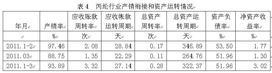 4丙綸行業(yè)產(chǎn)銷(xiāo)銜接和資產(chǎn)運(yùn)轉(zhuǎn)情況 從產(chǎn)銷(xiāo)銜接情況看,2011年1-3月份丙綸行業(yè)產(chǎn)銷(xiāo)率為93.89%,表明該行業(yè)產(chǎn)品銷(xiāo)售狀況較好;應(yīng)收賬款周轉(zhuǎn)率(主營(yíng)收入/應(yīng)收賬款凈額)為3.32次;應(yīng)收賬款運(yùn)轉(zhuǎn)周期(90天/應(yīng)收賬款周轉(zhuǎn)率)為27.14天,應(yīng)收賬款周轉(zhuǎn)次數(shù)越多,或者應(yīng)收賬款周轉(zhuǎn)天數(shù)越少,表明其實(shí)現(xiàn)利潤(rùn)的通道越加通暢。從資產(chǎn)運(yùn)轉(zhuǎn)情況看,丙綸行業(yè)總資產(chǎn)周轉(zhuǎn)率(主營(yíng)收入/資產(chǎn)合計(jì))2011年1-3月份為0.28次,總資產(chǎn)運(yùn)轉(zhuǎn)周期(90天/總資產(chǎn)周轉(zhuǎn)率)為322.37天,總資產(chǎn)周轉(zhuǎn)次數(shù)越多,或者總資產(chǎn)周轉(zhuǎn)天數(shù)越少,表明資產(chǎn)利用效率越高。丙綸行業(yè)資產(chǎn)負(fù)債率2011年1-3月份為51.96%,表明財(cái)務(wù)政策的運(yùn)作較為穩(wěn)??;凈資產(chǎn)收益率為3.02%,表明該行業(yè)凈資產(chǎn)運(yùn)作效率較高。