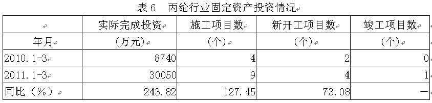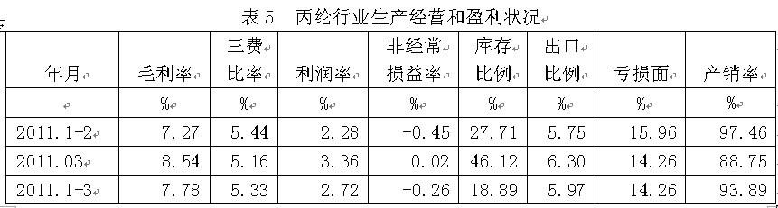 5丙綸行業(yè)生產(chǎn)經(jīng)營(yíng)和盈利狀況 從企業(yè)生產(chǎn)經(jīng)營(yíng)和盈利狀況看,丙綸行業(yè)毛利率2011年1-3月份為7.78%,三費(fèi)比率(營(yíng)業(yè)、管理和財(cái)務(wù)費(fèi)用率之和)為5.33%,利潤(rùn)率為2.72%,如果剔除非經(jīng)常性損益的影響,名義稅前利潤(rùn)率為2.46%;該行業(yè)庫(kù)存比率為18.89%,表明產(chǎn)品銷(xiāo)售正常;出口比例為5.97%,表明出口狀況較好;該行業(yè)虧損面為14.26%。由此可見(jiàn),在丙綸行業(yè)中,生產(chǎn)經(jīng)營(yíng)狀況運(yùn)作得較好。