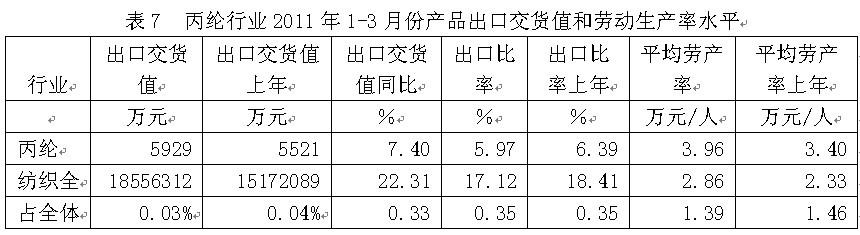 7丙綸行業(yè)產(chǎn)品出口交貨值和勞動(dòng)生產(chǎn)率水平 從行業(yè)產(chǎn)品出口交貨值和勞動(dòng)生產(chǎn)率水平看,2011年1-3月份丙綸行業(yè)產(chǎn)品出口交貨值為0.59億元,占紡織全行業(yè)的0.03%;出口交貨值比上年同期增加7.40%;該行業(yè)產(chǎn)品出口比率(出口交貨值/工業(yè)銷(xiāo)售產(chǎn)值)為5.97%,而上年同期為6.39%,表明該行業(yè)產(chǎn)品出口狀況較好;從勞動(dòng)生產(chǎn)率的水平看,2011年1-3月份丙綸行業(yè)平均勞產(chǎn)率(工業(yè)增加值/從業(yè)人數(shù))為3.96萬(wàn)元/人,而上年同期為3.40萬(wàn)元/人,表明該行業(yè)勞動(dòng)生產(chǎn)率的實(shí)際水平較為理想。