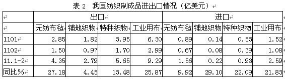 在進(jìn)口方面,我國(guó)2011年1-2月份無(wú)紡布?xì)?、絮進(jìn)口總額1.56億美元,同比增加9.92%;鋪地織物進(jìn)口總額0.22億美元,同比增加29.10%;特種織物(及花邊)進(jìn)口總額0.93億美元,同比增加22.09%;工業(yè)用布(及涂層布)進(jìn)口總額2.59億美元,同比增加21.83%;顯示中國(guó)紡織制成品外貿(mào)形勢(shì)較好。