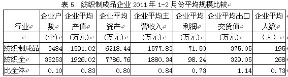 從企業(yè)平均規(guī)模的變化情況看,2011年1-2月份紡織制成品企業(yè)平均產(chǎn)值為1591萬(wàn)元,為紡織全行業(yè)平均數(shù)的0.83倍;企業(yè)平均資產(chǎn)為6218萬(wàn)元,為行業(yè)平均數(shù)的0.80倍;企業(yè)平均主營(yíng)收入為1578萬(wàn)元,為行業(yè)平均數(shù)的0.84倍;企業(yè)平均利潤(rùn)為71.50萬(wàn)元,為行業(yè)平均數(shù)的0.73倍;企業(yè)平均出口交貨值為375.05萬(wàn)元,為行業(yè)平均數(shù)的1.14倍;企業(yè)平均人數(shù)為195人,為行業(yè)平均數(shù)的0.73倍。由此可見(jiàn),紡織制成品企業(yè)的平均規(guī)模低于紡織全行業(yè)的平均水平,反映該行業(yè)中小企業(yè)較多,與該行業(yè)的特點(diǎn)較為接近。