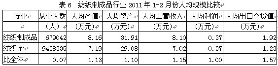 從行業(yè)人均規(guī)模的變化情況看,2011年1-2月份紡織制成品行業(yè)人均產(chǎn)值為8.16萬(wàn)元,為紡織全行業(yè)平均數(shù)的1.13倍;人均資產(chǎn)為31.91萬(wàn)元,為行業(yè)平均數(shù)的1.10倍;人均主營(yíng)收入為8.10萬(wàn)元,為行業(yè)平均數(shù)的1.15倍;人均利潤(rùn)為0.37萬(wàn)元,為行業(yè)平均數(shù)的1.00倍;人均出口交貨值為1.92萬(wàn)元,為行業(yè)平均數(shù)的1.57倍。由此可見(jiàn),紡織制成品行業(yè)的人均產(chǎn)值、人均資產(chǎn)、人均主營(yíng)收入接近于紡織全行業(yè)的平均數(shù),反映該行業(yè)勞動(dòng)生產(chǎn)率較高,綜合競(jìng)爭(zhēng)力較強(qiáng),對(duì)全行業(yè)的貢獻(xiàn)較為可觀。