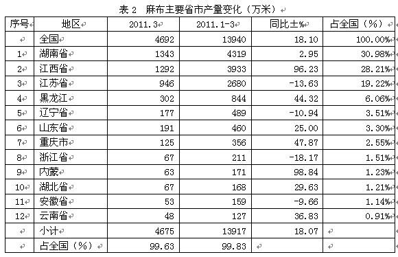 全國(guó)麻布2011年1-3月份產(chǎn)量合計(jì)為13940萬(wàn)米,比上年同期增加18.10%;其中產(chǎn)量最大的省市是湖南省,產(chǎn)量為4319萬(wàn)米,為省市龍頭;其次是江西省,產(chǎn)量3933萬(wàn)米,位居亞軍;然后是江蘇省,產(chǎn)量2680萬(wàn)米,榮立第三;黑龍江844萬(wàn)米,為第四;遼寧省489萬(wàn)米,占第五;山東省460萬(wàn)米,位居第六;接下來(lái)是重慶市356萬(wàn)米,為第七;浙江省211萬(wàn)米,占第八;內(nèi)蒙171萬(wàn)米,位居第九;湖北省168萬(wàn)米,為第十名;安徽省159萬(wàn)米,居第11名;云南省127萬(wàn)米,榮立第12名。上述12大省市2011年1-3月份產(chǎn)量合計(jì)為13917萬(wàn)米,占全國(guó)2011年1-3月份總產(chǎn)量的99.83%。