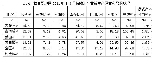 從生產(chǎn)經(jīng)營(yíng)和盈利狀況看,蒙青疆紡織產(chǎn)業(yè)鏈毛利率2011年1-3月份為13.21%,為全國(guó)平均數(shù)的1.07倍,三費(fèi)比率(營(yíng)業(yè)、管理和財(cái)務(wù)費(fèi)用率之和)為7.41%,為全國(guó)平均數(shù)的1.22倍,利潤(rùn)率為3.78%,為全國(guó)平均數(shù)的0.74倍;庫(kù)存比率為37.57%,為全國(guó)平均數(shù)的2.11倍;出口比例為4.91%,為全國(guó)平均數(shù)的0.29倍;企業(yè)虧損面為25.63%,為全國(guó)平均數(shù)的1.71倍。由此可見(jiàn),蒙青疆地區(qū)的盈利狀況接近于全國(guó)紡織產(chǎn)業(yè)鏈的平均水平。