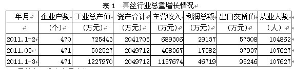 據(jù)國家統(tǒng)計局公布的數(shù)據(jù),2011年1-3月份我國規(guī)模以上真絲行業(yè)企業(yè)數(shù)量為471家,該行業(yè)實現(xiàn)工業(yè)總產(chǎn)值122.80億元,同比增加38.50%;資產(chǎn)合計204.97億元,同比增加22.12%;實現(xiàn)主營收入115.77億元,同比增加38.62%;完成利潤總額4.67億元,比上年同期增加2.10億元,同比增加81.64%;完成出口交貨值9.5億元,同比增加29.92%;行業(yè)整體從業(yè)人數(shù)10.76萬人,同比增加3.25%。由此可見,真絲行業(yè)總量增長勢頭良好,并為我國經(jīng)濟、財政、出口和就業(yè)作出了重大的貢獻。