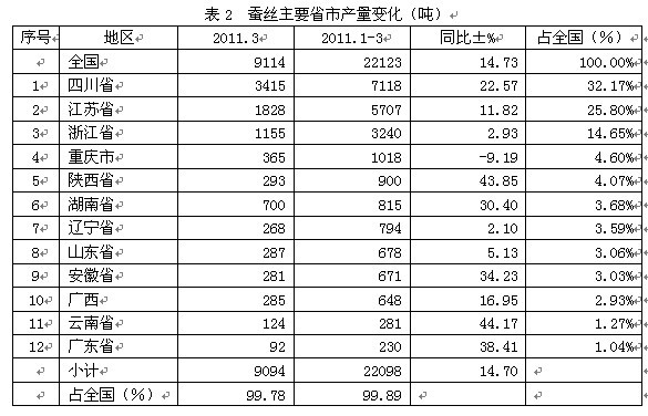 從2011年3月份的情況看,全國蠶絲當月總產(chǎn)量為0.91萬噸,上述12大省市的當月產(chǎn)量合計為0.91萬噸,占全國當月總產(chǎn)量的99.78%;由此可見,我國前12大省市的蠶絲產(chǎn)量約占全國總產(chǎn)量的絕大部分。