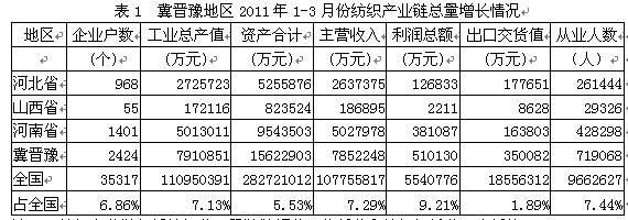 據(jù)國(guó)家統(tǒng)計(jì)局公布的數(shù)據(jù),2011年1-3月份我國(guó)冀晉豫三省(河北省、山西省、河南?。┘徔棶a(chǎn)業(yè)鏈(從紡織上游原料到下游服裝)規(guī)模以上企業(yè)數(shù)量為2424家,占全國(guó)總數(shù)的6.86%;工業(yè)總產(chǎn)值為791.09億元,占7.13%;資產(chǎn)合計(jì)為1562.29億元,占5.53%;主營(yíng)收入為785.22億元,占7.29%;利潤(rùn)總額為51.01億元,占9.21%;出口交貨值為35.01億元,占1.89%;從業(yè)人數(shù)為71.91萬(wàn)人,占7.44%。由此可見(jiàn),冀晉豫地區(qū)紡織產(chǎn)業(yè)鏈總產(chǎn)值、總資產(chǎn)、主營(yíng)收入、利潤(rùn)總額、出口和就業(yè)均給全國(guó)作出了較大的貢獻(xiàn)。
