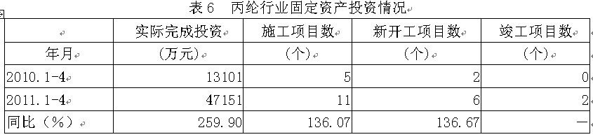 據(jù)國(guó)家統(tǒng)計(jì)局公布的數(shù)據(jù),2011年1-4月份丙綸行業(yè)實(shí)際完成投資額4.72億元,同比增加259.90%;當(dāng)年以來(lái)到目前為止施工項(xiàng)目總數(shù)為11個(gè),同比增加136.07%;其中新開工項(xiàng)目數(shù)6個(gè),同比增加136.67%;截至4月底為止,已實(shí)現(xiàn)竣工項(xiàng)目數(shù)2個(gè),表明該行業(yè)投資項(xiàng)目進(jìn)展較好。