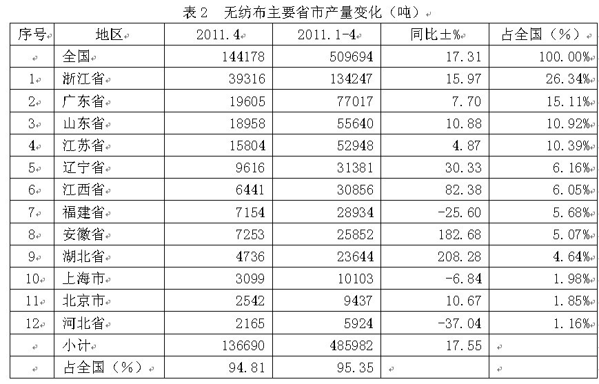 全國(guó)無(wú)紡布2011年1-4月份產(chǎn)量合計(jì)為50.97萬(wàn)噸,比上年同期增加17.31%;其中產(chǎn)量最大的省市是浙江省,產(chǎn)量為13.42萬(wàn)噸,為省市龍頭;其次是廣東省,產(chǎn)量7.70萬(wàn)噸,位居亞軍;然后是山東省,產(chǎn)量5.56萬(wàn)噸,榮立第三;江蘇省5.29萬(wàn)噸,為第四;遼寧省3.14萬(wàn)噸,占第五;江西省3.09萬(wàn)噸,位居第六;接下來(lái)是福建省2.89萬(wàn)噸,為第七;安徽省2.59萬(wàn)噸,占第八;湖北省2.36萬(wàn)噸,位居第九;上海市1.01萬(wàn)噸,為第十名;北京市0.94萬(wàn)噸,居第11名;河北省0.59萬(wàn)噸,榮立第12名。上述12大省市2011年1-4月份產(chǎn)量合計(jì)為48.60萬(wàn)噸,占全國(guó)2011年1-4月份總產(chǎn)量的95.35%。