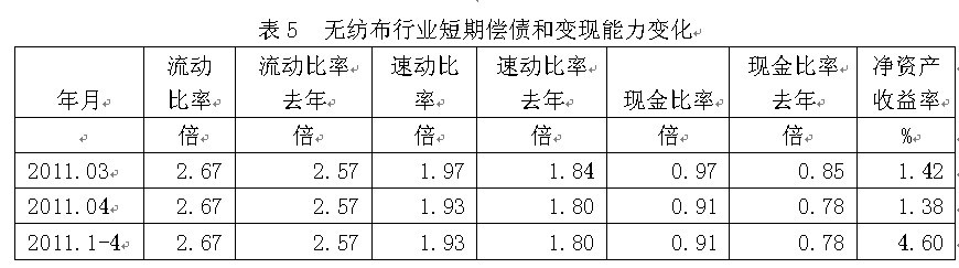 無(wú)紡布行業(yè)資產(chǎn)負(fù)債率2011年1-4月份為51.16%,表明財(cái)務(wù)政策的運(yùn)作較為穩(wěn)健;凈資產(chǎn)收益率為4.60%,表明該行業(yè)凈資產(chǎn)運(yùn)作效率較高。