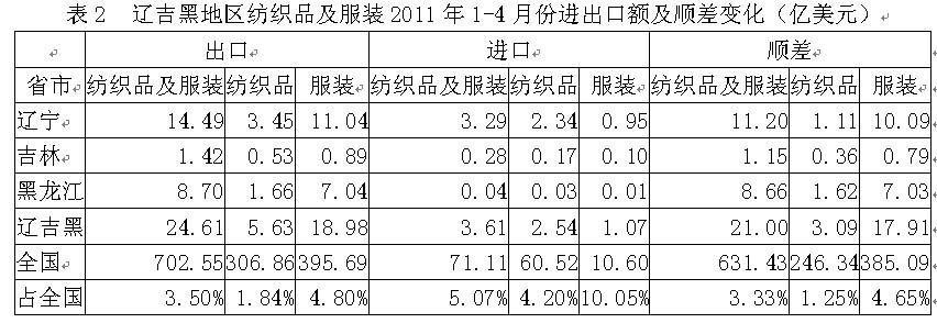 我國遼吉黑三省2011年1-4月份紡織品及服裝出口額為24.61億美元,占全國紡織品服裝出口總額的3.50%,其中紡織品出口額為5.63億美元,占全國1.84%,服裝出口額為18.98億美元,占全國4.80%;在進口方面,遼吉黑三省紡織品及服裝進口額為3.61億美元,占全國紡織品服裝進口總額的5.07%,其中紡織品進口額為2.54億美元,占全國4.20%,服裝進口額為1.07億美元,占全國10.05%;顯示我國遼吉黑地區(qū)紡織品服裝出口總額遠高于進口總額,順差明顯,表明該地區(qū)紡織品服裝在國際市場上競爭力較強。