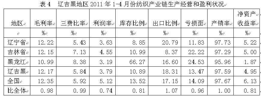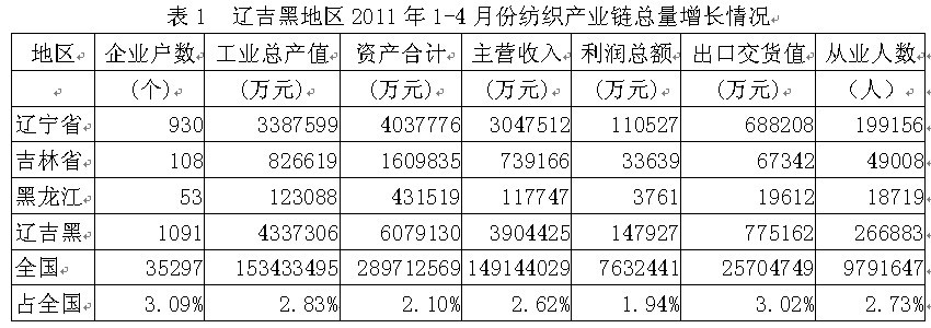 據(jù)國家統(tǒng)計局公布的數(shù)據(jù),2011年1-4月份我國遼吉黑三?。ㄟ|寧省、吉林省、黑龍江)紡織產(chǎn)業(yè)鏈(從紡織上游原料到下游服裝)規(guī)模以上企業(yè)數(shù)量為1091家,占全國總數(shù)的3.09%;工業(yè)總產(chǎn)值為433.73億元,占2.83%;資產(chǎn)合計為607.91億元,占2.10%;主營收入為390.44億元,占2.62%;利潤總額為14.79億元,占1.94%;出口交貨值為77.52億元,占3.02%;從業(yè)人數(shù)為26.69萬人,占2.73%。由此可見,遼吉黑地區(qū)紡織產(chǎn)業(yè)鏈總產(chǎn)值、總資產(chǎn)、主營收入、出口和就業(yè)均給全國作出了一定的貢獻。