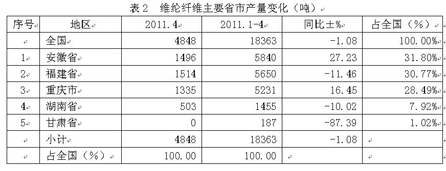 全國(guó)維綸纖維2011年1-4月份產(chǎn)量合計(jì)為1.84萬(wàn)噸,比上年同期減少1.08%;其中產(chǎn)量最大的省市是安徽省,產(chǎn)量為0.58萬(wàn)噸,為省市龍頭;其次是福建省,產(chǎn)量0.56萬(wàn)噸,位居亞軍;然后是重慶市,產(chǎn)量0.52萬(wàn)噸,榮立第三;湖南省0.15萬(wàn)噸,為第四;甘肅省0.02萬(wàn)噸,占第五;上述5大省市2011年1-4月份產(chǎn)量合計(jì)為1.84萬(wàn)噸,占全國(guó)2011年1-4月份總產(chǎn)量的100.00%。