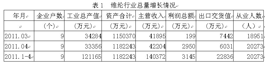 據(jù)國(guó)家統(tǒng)計(jì)局公布的數(shù)據(jù),2011年1-4月份我國(guó)規(guī)模以上維綸行業(yè)企業(yè)數(shù)量為9家,該行業(yè)實(shí)現(xiàn)工業(yè)總產(chǎn)值12.12億元,同比增加18.87%;資產(chǎn)合計(jì)118.22億元,同比增加16.83%;實(shí)現(xiàn)主營(yíng)收入14.04億元,同比增加35.37%;完成利潤(rùn)總額0.31億元,比上年同期增加0.10億元,同比增加44.34%;完成出口交貨值2.28億元,同比增加19.16%;行業(yè)整體從業(yè)人數(shù)2.03萬(wàn)人,同比增加3.87%。由此可見(jiàn),維綸行業(yè)總量增長(zhǎng)勢(shì)頭良好,并為我國(guó)經(jīng)濟(jì)、財(cái)政、出口和就業(yè)作出了重大的貢獻(xiàn)。