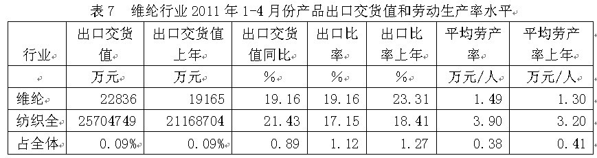 從行業(yè)產(chǎn)品出口交貨值和勞動(dòng)生產(chǎn)率水平看,2011年1-4月份維綸行業(yè)產(chǎn)品出口交貨值為2.28億元,占紡織全行業(yè)的0.09%;出口交貨值比上年同期增加19.16%;該行業(yè)產(chǎn)品出口比率(出口交貨值/工業(yè)銷售產(chǎn)值)為19.16%,而上年同期為23.31%,表明該行業(yè)產(chǎn)品出口狀況較好;從勞動(dòng)生產(chǎn)率的水平看,2011年1-4月份維綸行業(yè)平均勞產(chǎn)率(工業(yè)增加值/從業(yè)人數(shù))為1.49萬(wàn)元/人,而上年同期為1.30萬(wàn)元/人,表明該行業(yè)勞動(dòng)生產(chǎn)率的實(shí)際水平較為理想。