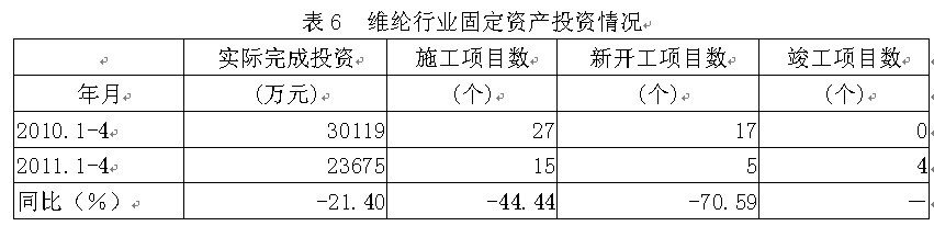 據(jù)國(guó)家統(tǒng)計(jì)局公布的數(shù)據(jù),2011年1-4月份維綸行業(yè)實(shí)際完成投資額2.37億元,同比減少21.40%;當(dāng)年以來(lái)到目前為止施工項(xiàng)目總數(shù)為15個(gè),同比減少44.44%;其中新開(kāi)工項(xiàng)目數(shù)5個(gè),同比減少70.59%;截至4月底為止,已實(shí)現(xiàn)竣工項(xiàng)目數(shù)4個(gè),占施工項(xiàng)目總數(shù)的26.67%,表明該行業(yè)投資項(xiàng)目進(jìn)展較好。