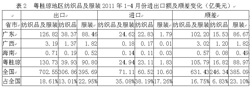 我國粵桂瓊?cè)?011年1-4月份紡織品及服裝出口額為130.73億美元,占全國紡織品服裝出口總額的18.61%,其中紡織品出口額為39.93億美元,占全國13.01%,服裝出口額為90.80億美元,占全國22.95%;在進(jìn)口方面,粵桂瓊?cè)〖徔椘芳胺b進(jìn)口額為24.94億美元,占全國紡織品服裝進(jìn)口總額的35.08%,其中紡織品進(jìn)口額為23.11億美元,占全國38.19%,服裝進(jìn)口額為1.83億美元,占全國17.26%;顯示我國粵桂瓊地區(qū)紡織品服裝出口總額遠(yuǎn)高于進(jìn)口總額,順差明顯,表明該地區(qū)紡織品服裝在國際市場上競爭力較強(qiáng)。