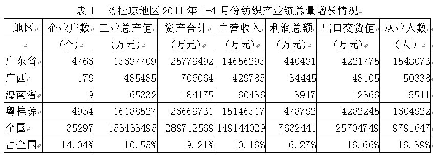 據(jù)國家統(tǒng)計(jì)局公布的數(shù)據(jù),2011年1-4月份我國粵桂瓊?cè)。◤V東省、廣西、海南?。┘徔棶a(chǎn)業(yè)鏈(從紡織上游原料到下游服裝)規(guī)模以上企業(yè)數(shù)量為4954家,占全國總數(shù)的14.04%;工業(yè)總產(chǎn)值為1618.85億元,占10.55%;資產(chǎn)合計(jì)為2666.97億元,占9.21%;主營收入為1514.65億元,占10.16%;利潤總額為47.88億元,占6.27%;出口交貨值為428.22億元,占16.66%;從業(yè)人數(shù)為160.49萬人,占16.39%。由此可見,粵桂瓊地區(qū)紡織產(chǎn)業(yè)鏈總產(chǎn)值、總資產(chǎn)、主營收入、利潤總額、出口和就業(yè)均給全國作出了較大的貢獻(xiàn)。