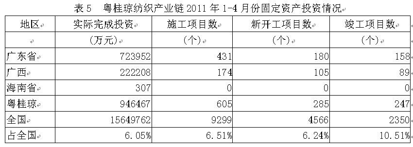 據(jù)國家統(tǒng)計(jì)局公布的數(shù)據(jù),2011年1-4月份粵桂瓊地區(qū)紡織產(chǎn)業(yè)鏈實(shí)際完成投資額94.65億元,占全國實(shí)際投資總額的6.05%;當(dāng)年以來到目前為止施工項(xiàng)目總數(shù)為605個(gè),占全國施工總數(shù)的6.51%;其中新開工項(xiàng)目數(shù)285個(gè),占全國新開工項(xiàng)目總數(shù)的6.24%;截至4月底為止,已實(shí)現(xiàn)竣工項(xiàng)目數(shù)247個(gè),占全國已竣工項(xiàng)目總數(shù)的10.51%,占該地區(qū)施工項(xiàng)目總數(shù)的40.83%,表明該地區(qū)投資項(xiàng)目進(jìn)展較好。
