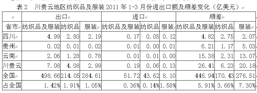 我國川貴云三省2011年1-3月份紡織品及服裝出口額為7.08億美元,占全國紡織品服裝出口總額的1.42%,其中紡織品出口額為4.08億美元,占全國1.91%,服裝出口額為2.99億美元,占全國1.05%;在進口方面,川貴云三省紡織品及服裝進口額為0.19億美元,占全國紡織品服裝進口總額的0.36%,其中紡織品進口額為0.06億美元,占全國0.14%,服裝進口額為0.13億美元,占全國1.58%;顯示我國川貴云地區(qū)紡織品服裝出口總額遠高于進口總額,順差明顯,表明該地區(qū)紡織品服裝在國際市場上競爭力較強。