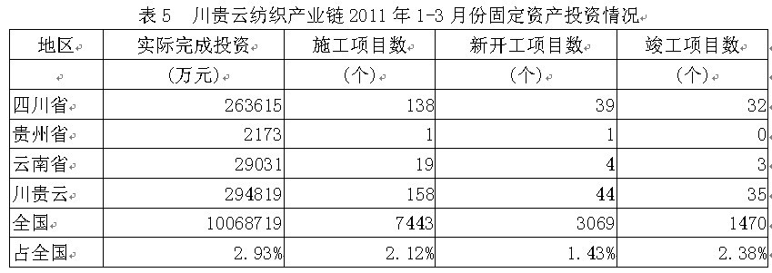 據(jù)國家統(tǒng)計局公布的數(shù)據(jù),2011年1-3月份川貴云地區(qū)紡織產(chǎn)業(yè)鏈實際完成投資額29.48億元,占全國實際投資總額的2.93%;當年以來到目前為止施工項目總數(shù)為158個,占全國施工總數(shù)的2.12%;其中新開工項目數(shù)44個,占全國新開工項目總數(shù)的1.43%;截至3月底為止,已實現(xiàn)竣工項目數(shù)35個,占全國已竣工項目總數(shù)的2.38%,占該地區(qū)施工項目總數(shù)的22.15%,表明該地區(qū)投資項目進展較好。