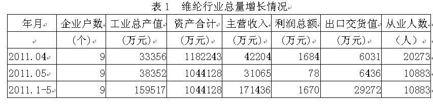 據(jù)國(guó)家統(tǒng)計(jì)局公布的數(shù)據(jù),2011年1-5月份我國(guó)規(guī)模以上維綸行業(yè)企業(yè)數(shù)量為9家,該行業(yè)實(shí)現(xiàn)工業(yè)總產(chǎn)值15.95億元,同比增加23.79%;資產(chǎn)合計(jì)104.41億元,同比減少4.57%;實(shí)現(xiàn)主營(yíng)收入17.14億元,同比增加28.54%;完成利潤(rùn)總額0.17億元,比上年同期減少0.19億元,同比減少53.28%;完成出口交貨值2.93億元,同比增加27.45%;行業(yè)整體從業(yè)人數(shù)1.09萬(wàn)人,同比減少44.19%。由此可見(jiàn),維綸行業(yè)總量增長(zhǎng)勢(shì)頭良好,并為我國(guó)經(jīng)濟(jì)、財(cái)政、出口和就業(yè)作出了重大的貢獻(xiàn)。