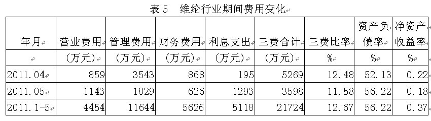 2011年1-5月份我國(guó)維綸行業(yè)營(yíng)業(yè)費(fèi)用為0.45億元,同比增加59.72%;管理費(fèi)用支出為1.16億元,同比增加51.30%;財(cái)務(wù)費(fèi)用為0.56億元,同比增加31.86%;其中利息支出0.51億元,同比增加2.21%,說(shuō)明債務(wù)作為維綸行業(yè)主要財(cái)務(wù)負(fù)擔(dān)仍然較重;三費(fèi)總計(jì)為2.17億元,同比增加47.27%;三費(fèi)比率(三費(fèi)合計(jì)/主營(yíng)收入)為12.67%,上年同期為11.06%,同比上升1.61個(gè)百分點(diǎn),表明期間費(fèi)用相對(duì)升高。