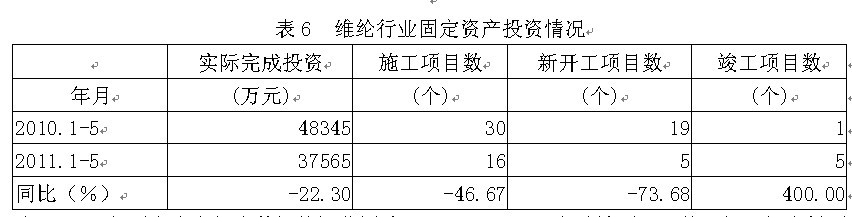 據(jù)國(guó)家統(tǒng)計(jì)局公布的數(shù)據(jù),2011年1-5月份維綸行業(yè)實(shí)際完成投資額3.76億元,同比減少22.30%;當(dāng)年以來(lái)到目前為止施工項(xiàng)目總數(shù)為16個(gè),同比減少46.67%;其中新開(kāi)工項(xiàng)目數(shù)5個(gè),同比減少73.68%;截至5月底為止,已實(shí)現(xiàn)竣工項(xiàng)目數(shù)5個(gè),同比增加400.00%,占施工項(xiàng)目總數(shù)的31.25%,表明該行業(yè)投資項(xiàng)目進(jìn)展較好。