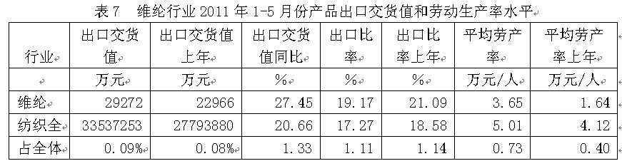 從行業(yè)產(chǎn)品出口交貨值和勞動(dòng)生產(chǎn)率水平看,2011年1-5月份維綸行業(yè)產(chǎn)品出口交貨值為2.93億元,占紡織全行業(yè)的0.09%;出口交貨值比上年同期增加27.45%;該行業(yè)產(chǎn)品出口比率(出口交貨值/工業(yè)銷(xiāo)售產(chǎn)值)為19.17%,而上年同期為21.09%,表明該行業(yè)產(chǎn)品出口狀況較好;從勞動(dòng)生產(chǎn)率的水平看,2011年1-5月份維綸行業(yè)平均勞產(chǎn)率(工業(yè)增加值/從業(yè)人數(shù))為3.65萬(wàn)元/人,而上年同期為1.64萬(wàn)元/人,表明該行業(yè)勞動(dòng)生產(chǎn)率的實(shí)際水平較為理想。