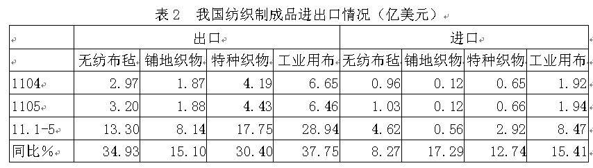 根據(jù)中國海關(guān)的統(tǒng)計數(shù)據(jù),我國2011年1-5月份無紡布氈、絮出口總額13.30億美元,同比增加34.93%;鋪地織物出口總額8.14億美元,同比增加15.10%;特種織物(及花邊)出口總額17.75億美元,同比增加30.40%;工業(yè)用布(及涂層布)出口總額28.94億美元,同比增加37.75%;