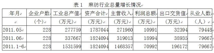 據(jù)國家統(tǒng)計(jì)局公布的數(shù)據(jù),2011年1-6月份我國規(guī)模以上麻紡行業(yè)企業(yè)數(shù)量為228家,該行業(yè)實(shí)現(xiàn)工業(yè)總產(chǎn)值153.16億元,同比增加43.03%;資產(chǎn)合計(jì)182.41億元,同比增加11.69%;實(shí)現(xiàn)主營收入146.84億元,同比增加41.01%;完成利潤總額7.10億元,比上年同期增加3.46億元,同比增加95.26%;完成出口交貨值19.6億元,同比增加28.05%;行業(yè)整體從業(yè)人數(shù)7.97萬人,同比增加10.37%。由此可見,麻紡行業(yè)總量增長勢(shì)頭良好,并為我國經(jīng)濟(jì)、財(cái)政、出口和就業(yè)作出了重大的貢獻(xiàn)。