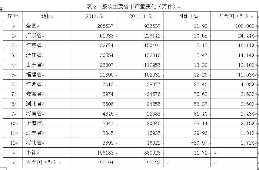 從2011年5月份的情況看,全國服裝當(dāng)月總產(chǎn)量為20.85億件,上述12大省市的當(dāng)月產(chǎn)量合計為19.82億件,占全國當(dāng)月總產(chǎn)量的95.04%;由此可見,我國前12大省市的服裝產(chǎn)量約占全國總產(chǎn)量的絕大部分。