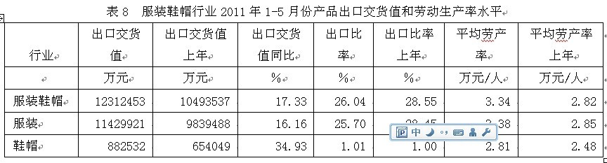 從企業(yè)生產(chǎn)經(jīng)營和盈利狀況看,服裝鞋帽行業(yè)毛利率2011年1-5月份為15.15%,三費比率(營業(yè)、管理和財務(wù)費用率之和)為8.17%,利潤率為5.48%,如果剔除非經(jīng)常性損益的影響,名義稅前利潤率為6.99%;該行業(yè)庫存比率為10.79%,表明產(chǎn)品銷售正常;出口比例為26.04%,表明出口狀況較好;該行業(yè)虧損面為14.65%。由此可見,在服裝鞋帽行業(yè)中,生產(chǎn)經(jīng)營狀況運作得較好。