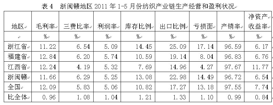 從生產(chǎn)經(jīng)營和盈利狀況看,浙閩贛紡織產(chǎn)業(yè)鏈毛利率2011年1-5月份為11.66%,為全國平均數(shù)的0.96倍,三費(fèi)比率(營業(yè)、管理和財(cái)務(wù)費(fèi)用率之和)為6.29%,為全國平均數(shù)的1.08倍,利潤率為5.25%,為全國平均數(shù)的1.04倍;庫存比率為13.08%,為全國平均數(shù)的1.21倍;出口比例為22.98%,為全國平均數(shù)的1.33倍;企業(yè)虧損面為14.49%,為全國平均數(shù)的1.10倍。由此可見,浙閩贛地區(qū)的盈利狀況接近于全國紡織產(chǎn)業(yè)鏈的平均水平。
