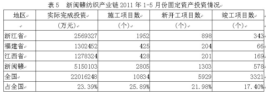 據(jù)國家統(tǒng)計(jì)局公布的數(shù)據(jù),2011年1-5月份浙閩贛地區(qū)紡織產(chǎn)業(yè)鏈實(shí)際完成投資額515.01億元,占全國實(shí)際投資總額的23.39%;當(dāng)年以來到目前為止施工項(xiàng)目總數(shù)為2805個(gè),占全國施工總數(shù)的25.89%;其中新開工項(xiàng)目數(shù)1303個(gè),占全國新開工項(xiàng)目總數(shù)的21.98%;截至5月底為止,已實(shí)現(xiàn)竣工項(xiàng)目數(shù)578個(gè),占全國已竣工項(xiàng)目總數(shù)的17.40%,占該地區(qū)施工項(xiàng)目總數(shù)的20.61%,表明該地區(qū)投資項(xiàng)目進(jìn)展較好。