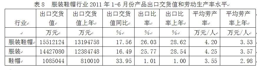從行業(yè)產(chǎn)品出口交貨值和勞動(dòng)生產(chǎn)率水平看,2011年1-6月份服裝鞋帽行業(yè)產(chǎn)品出口交貨值為1551.21億元,其中服裝業(yè)為1442.71億元,占93.01%;鞋帽業(yè)為108.50億元,占6.99%;服裝鞋帽行業(yè)產(chǎn)品出口比率(出口交貨值/工業(yè)銷售產(chǎn)值)為26.03%,其中服裝業(yè)為25.77%,鞋帽業(yè)為1.01%;從勞動(dòng)生產(chǎn)率的水平看,服裝鞋帽行業(yè)平均勞產(chǎn)率(工業(yè)增加值/從業(yè)人數(shù))為4.20萬元/人,其中服裝業(yè)為4.25萬元/人,鞋帽業(yè)為3.55萬元/人。由此可見,服裝業(yè)在產(chǎn)品出口方面更占優(yōu)勢(shì),但服裝業(yè)和鞋帽業(yè)在勞動(dòng)生產(chǎn)率水平方面均較為理想。