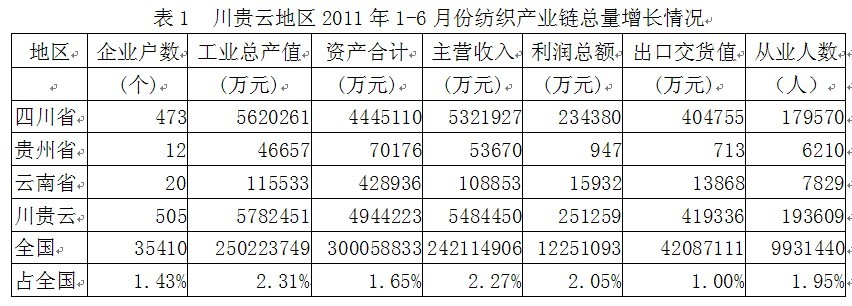 據國家統計局公布的數據,2011年1-6月份我國川貴云三省(四川省、貴州省、云南?。┘徔棶a業(yè)鏈(從紡織上游原料到下游服裝)規(guī)模以上企業(yè)數量為505家,占全國總數的1.43%;工業(yè)總產值為578.25億元,占2.31%;資產合計為494.42億元,占1.65%;主營收入為548.44億元,占2.27%;利潤總額為25.13億元,占2.05%;出口交貨值為41.93億元,占1.00%;從業(yè)人數為19.36萬人,占1.95%。由此可見,川貴云地區(qū)紡織產業(yè)鏈總產值、總資產、主營收入、利潤總額、出口和就業(yè)均給全國作出了一定的貢獻。